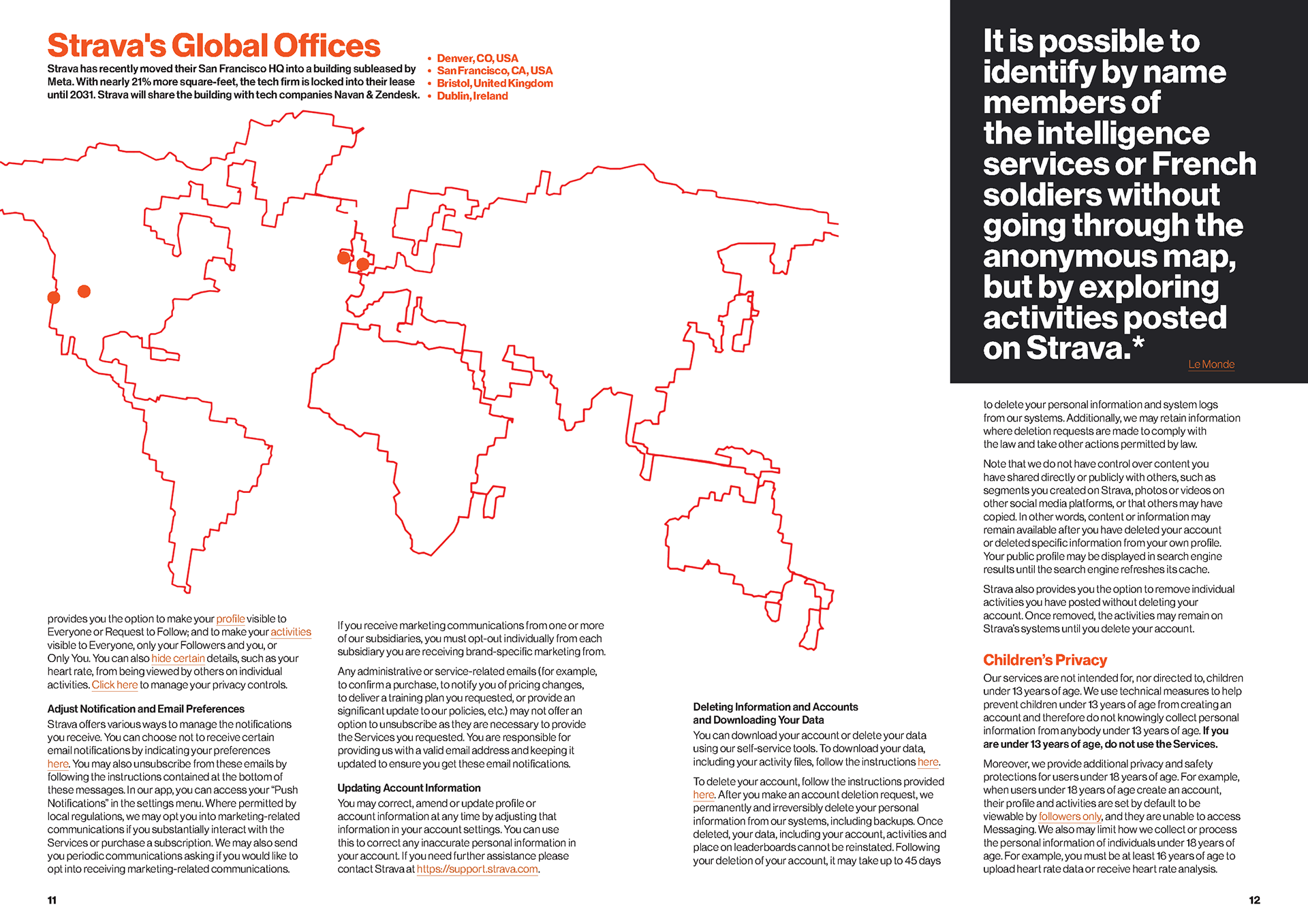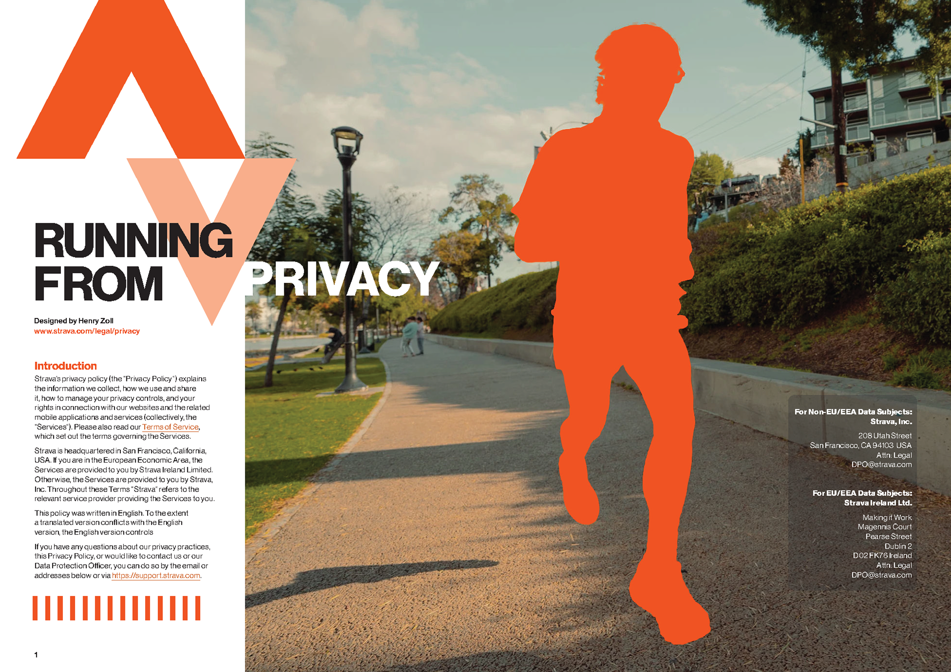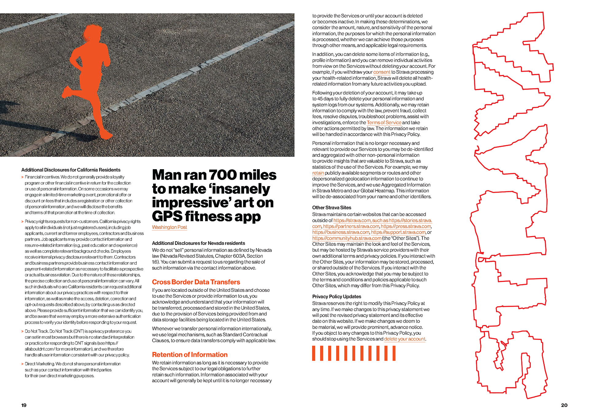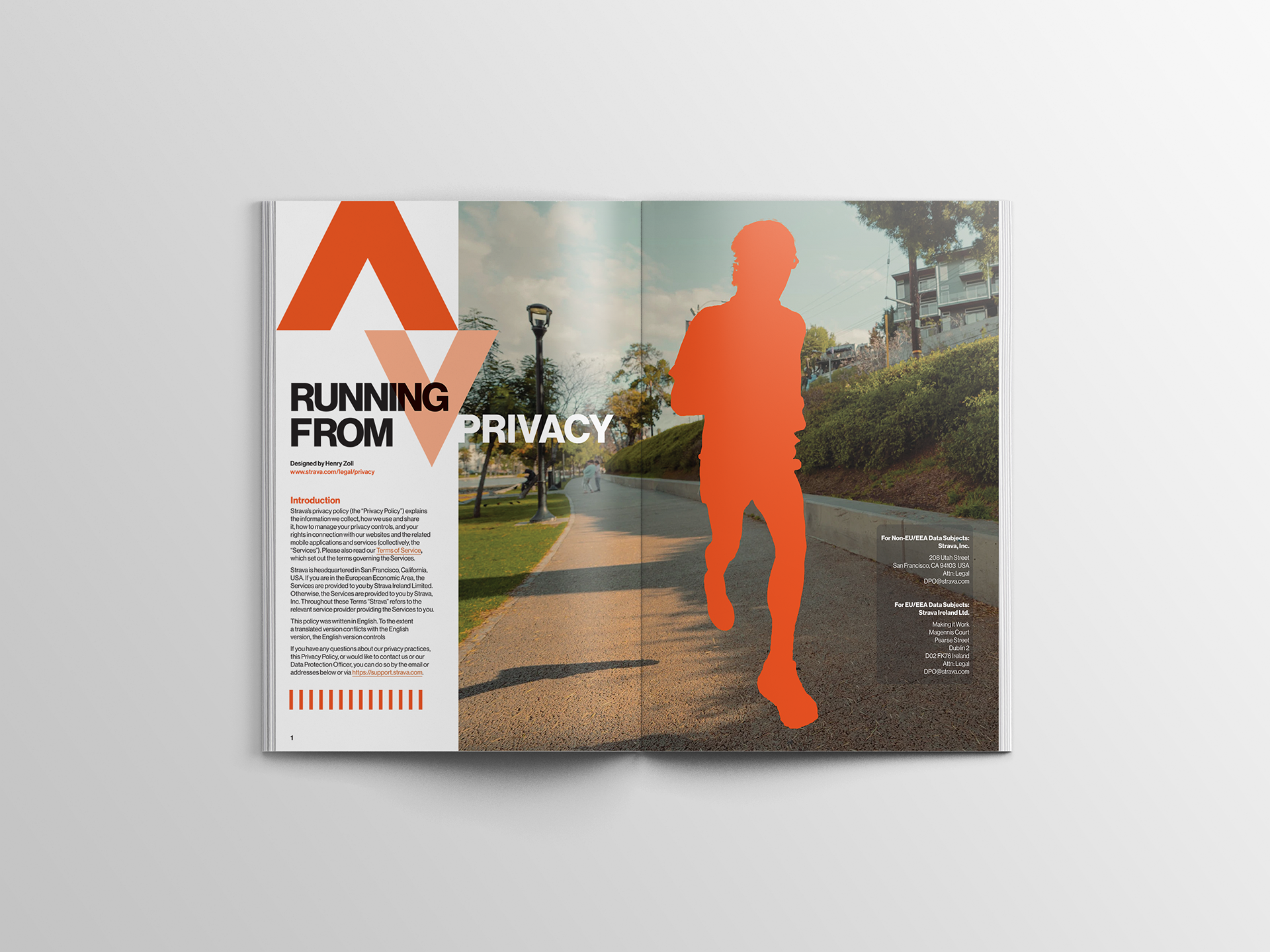 I chose the app Strava’s privacy policy as the content of this magazine. Each spread highlights skeptical parts of the policy, uses imagery from Strava to accentuate the narrative, and handles a large body of text.
